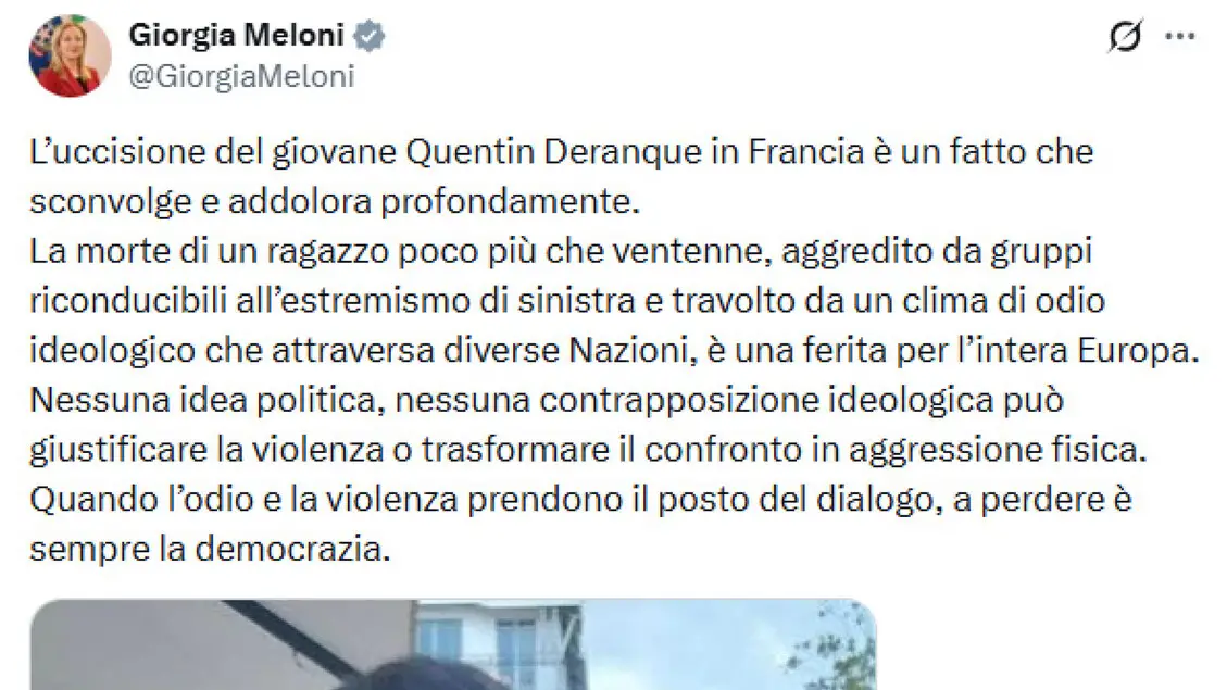 "Dalla premier cordoglio per Deranque e condanna all'odio ideologico"