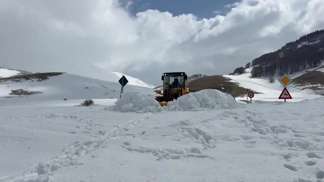 Gli spazzaneve aprono un varco nei muri di neve tra Marche e Umbria