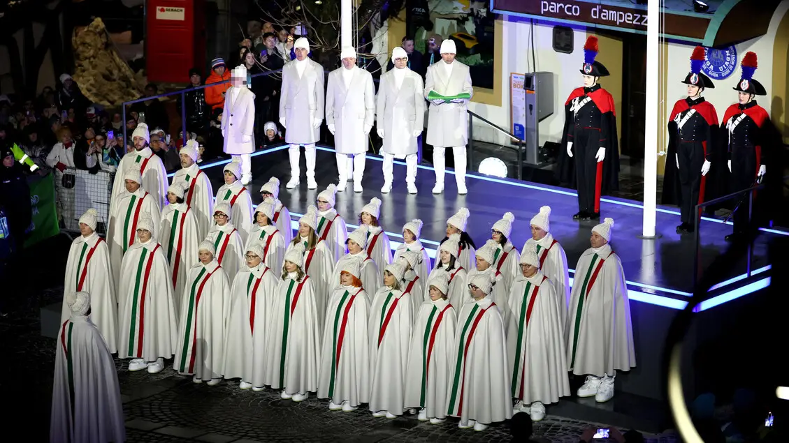 La cerimonia ricorda l'epopea del 1956, gli assi di ghiaccio e neve protagonisti