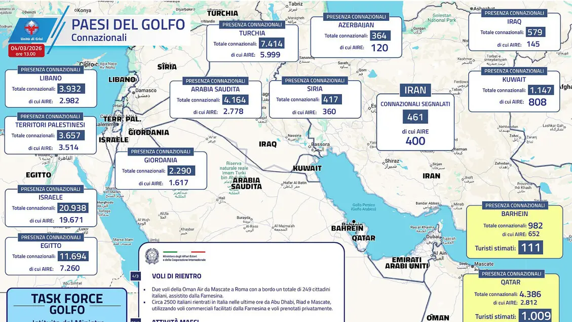 Secondo quanto riferito dalla Farnesina, la Task Force Golfo ha gestito dall'inizio della crisi oltre 13.500 contatti