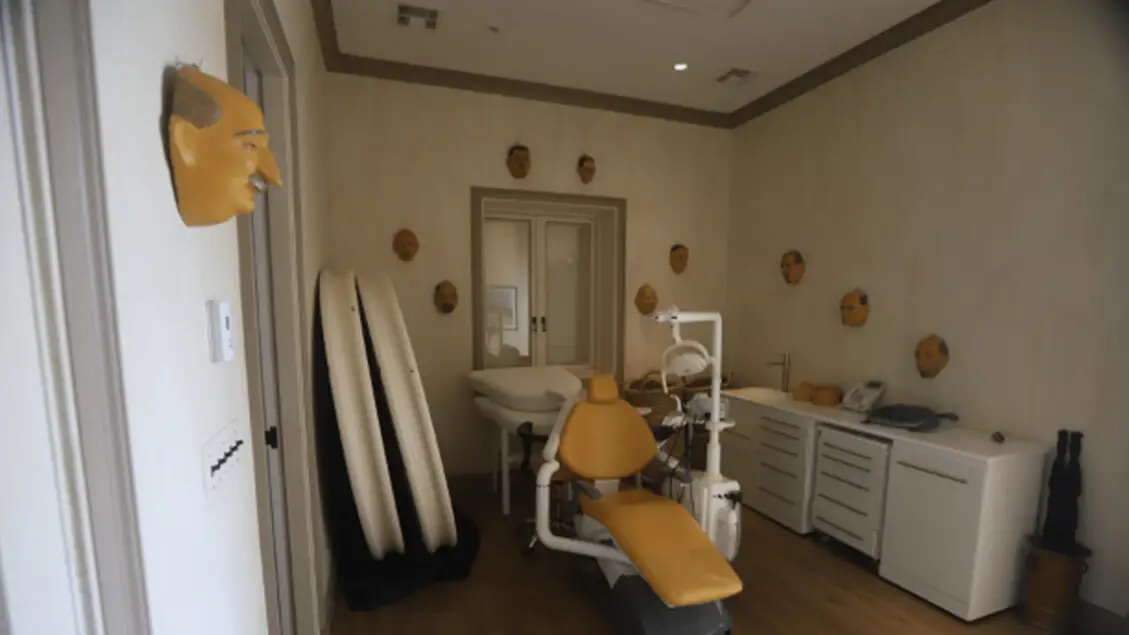 Poltrona del dentista e lavagna del potere nella villa a Little Saint James