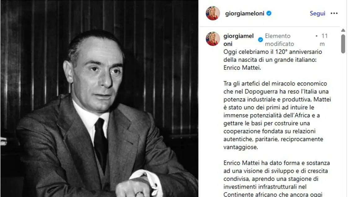 Meloni, Mattei ispirazione quotidiana nostro impegno, continueramo a farne tesoro