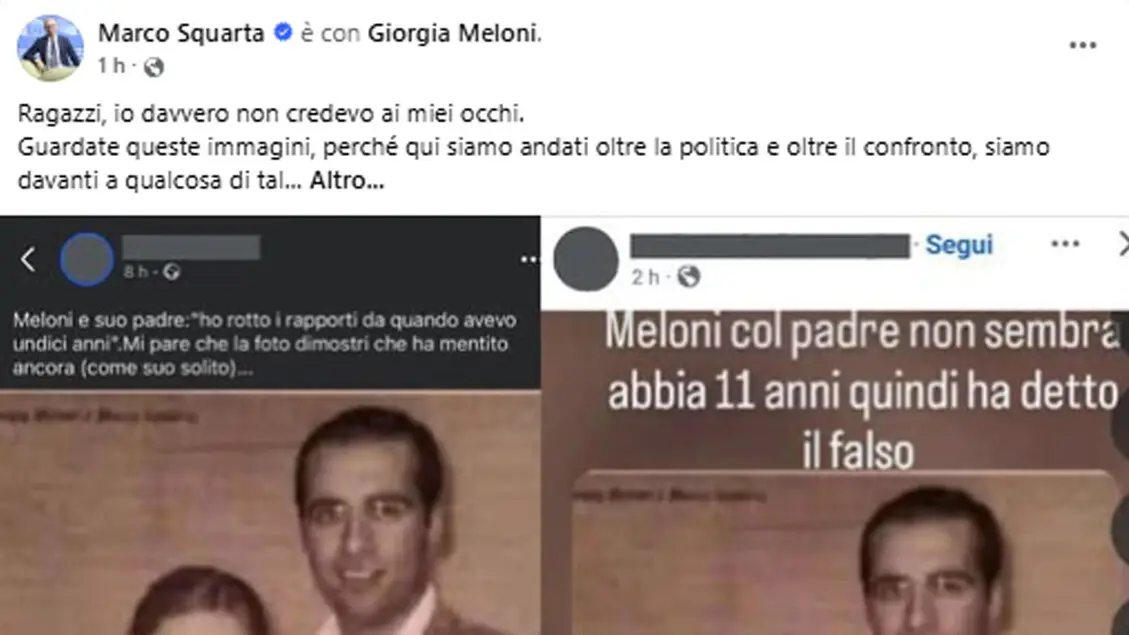 "In queste ore alcuni utenti stanno diffondendo una foto di qualche anno fa che mi ritrae con Marco Squarta, parlamentare europeo di Fratelli d'Italia, sostenendo addirittura che si tratterebbe di mio padre'.