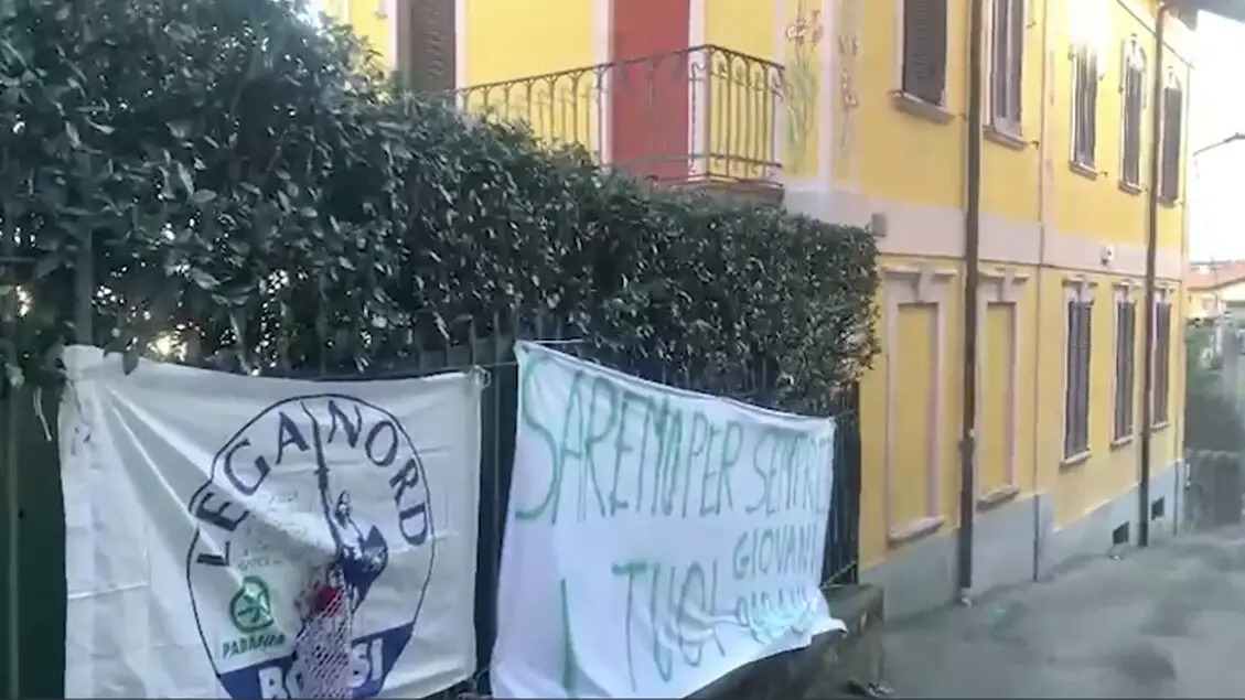 L'omaggio al fondatore della Lega all'esterno della sua abitazione insieme a un vessillo del partito