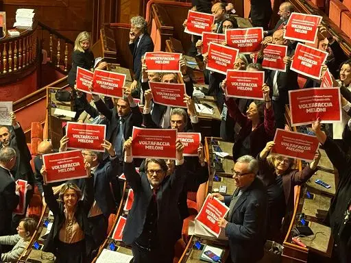 Manovra, la protesta dei senatori Pd con i cartelli in aula “Voltafaccia Meloni’