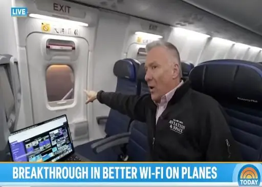 Tom Costello della Nbc presenta un programma da un Boeing 737 United
