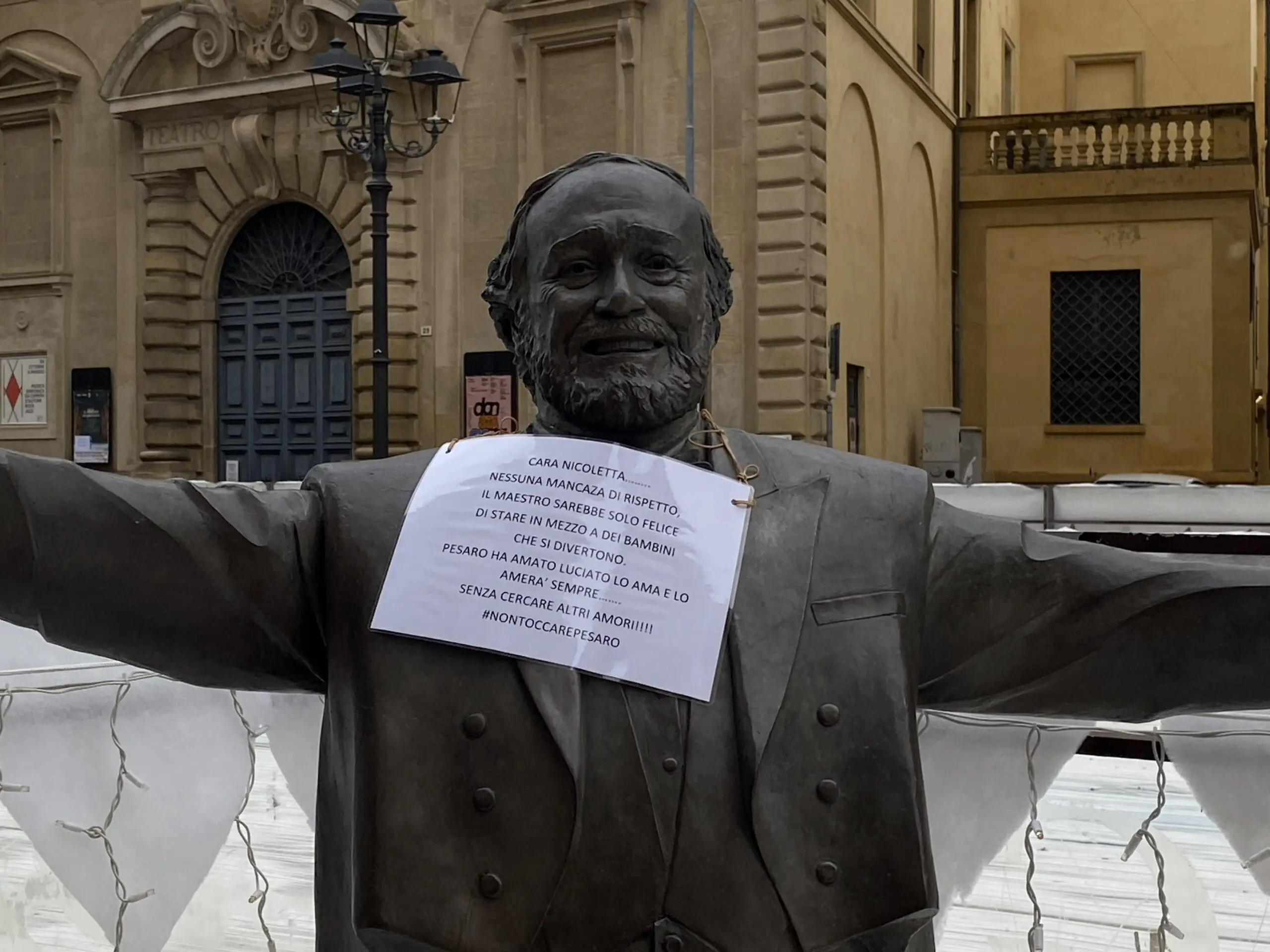 Pesaro, pista di pattinaggio attorno alla statua di Pavarotti: spunta un cartello contro Nicoletta Mantovani