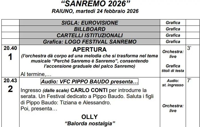 Scaletta Sanremo 2026, prima serata: il pdf Rai con orari e ospiti