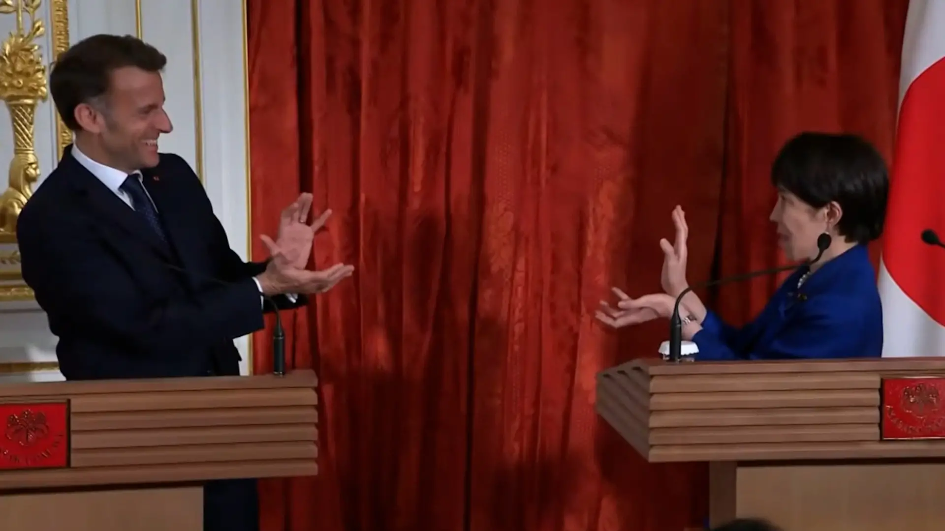 Emmanuel Macron e la premier giapponese Takaichi si salutano in stile Dragon Ball imitando l”onda energetica”