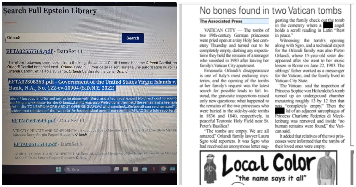 C’è anche il nome di Emanuela Orlandi negli Epstein files. Il mistero della scomparsa della cittadina vaticana compare nei documenti pubblicati dall’FBI lo scorso gennaio (accumulati in 20 anni di indagini) sul sito del Dipartimento di Giustizia degli Stati Uniti d’America. Nei file di indagine sulla rete di abusi sessuali del finanziere pedofilo Jeffrey Epstein, […] L'articolo Epstein files, spunta anche il nome di Emanuela Orlandi: ecco cosa collega la scomparsa della Vatican Girl e la più grande banca degli Stati Uniti d’America proviene da Il Fatto Quotidiano.