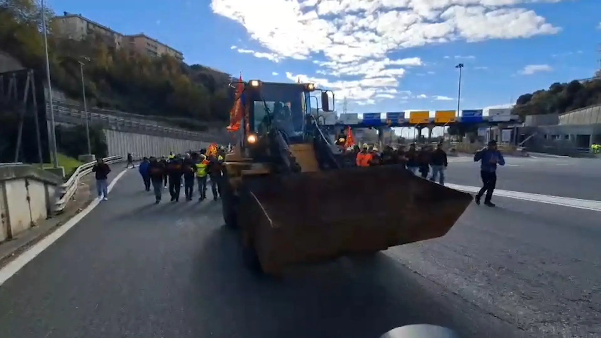 Ex Ilva, il video degli operai che bloccano l’autostrada a Genova: in corteo con la pala meccanica