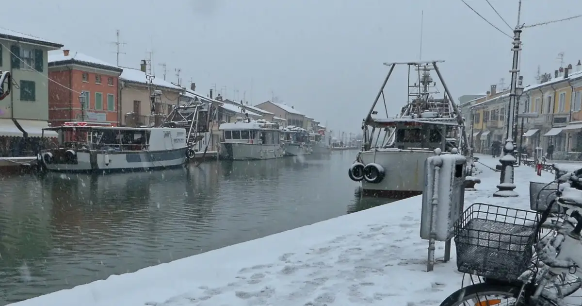 La neve imbianca anche le strade della Romagna: le immagini del porto di Cesenatico