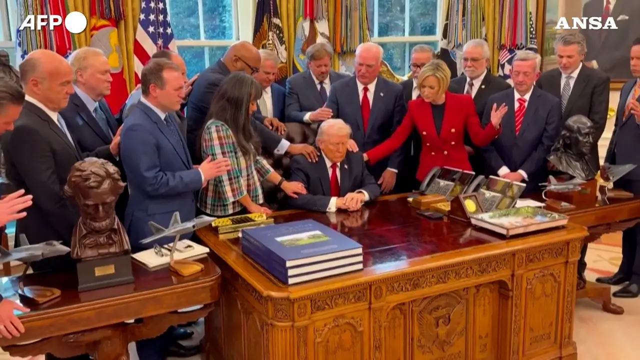 La preghiera per Trump nello studio ovale: pastori riuniti attorno al presidente lo toccano per benedirlo