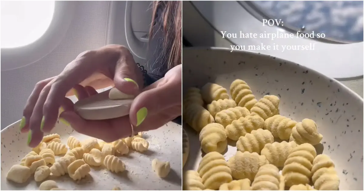 “Quando odi il cibo degli aerei e quindi ti arrangi da sola”: influencer prepara gnocchi fatti a mano sul tavolino dell’aereo e scatta la polemica