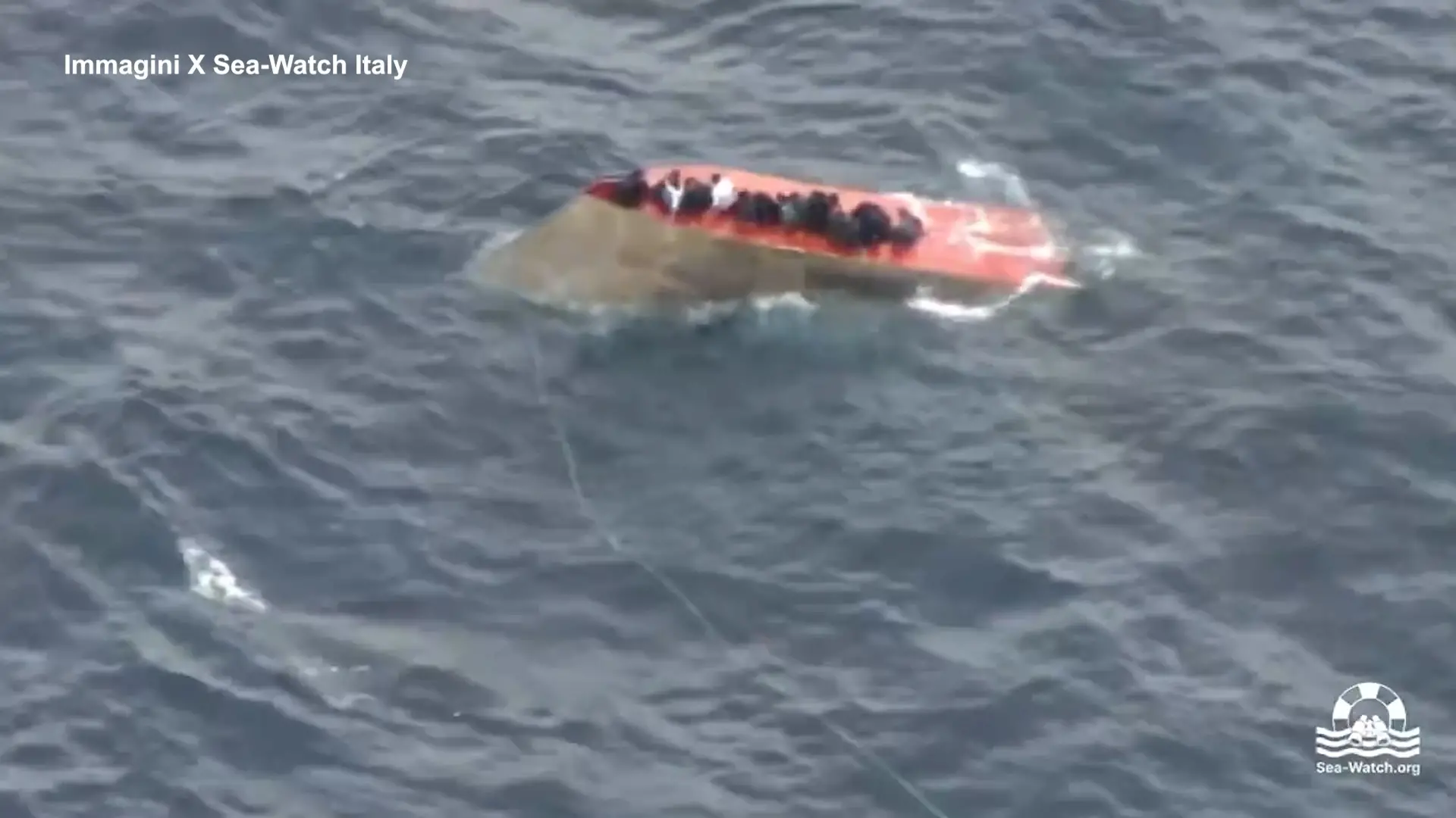 Le immagini del barcone ribaltato nel Mediterraneo: i migranti cercano di salvarsi aggrappandosi allo scafo – Video