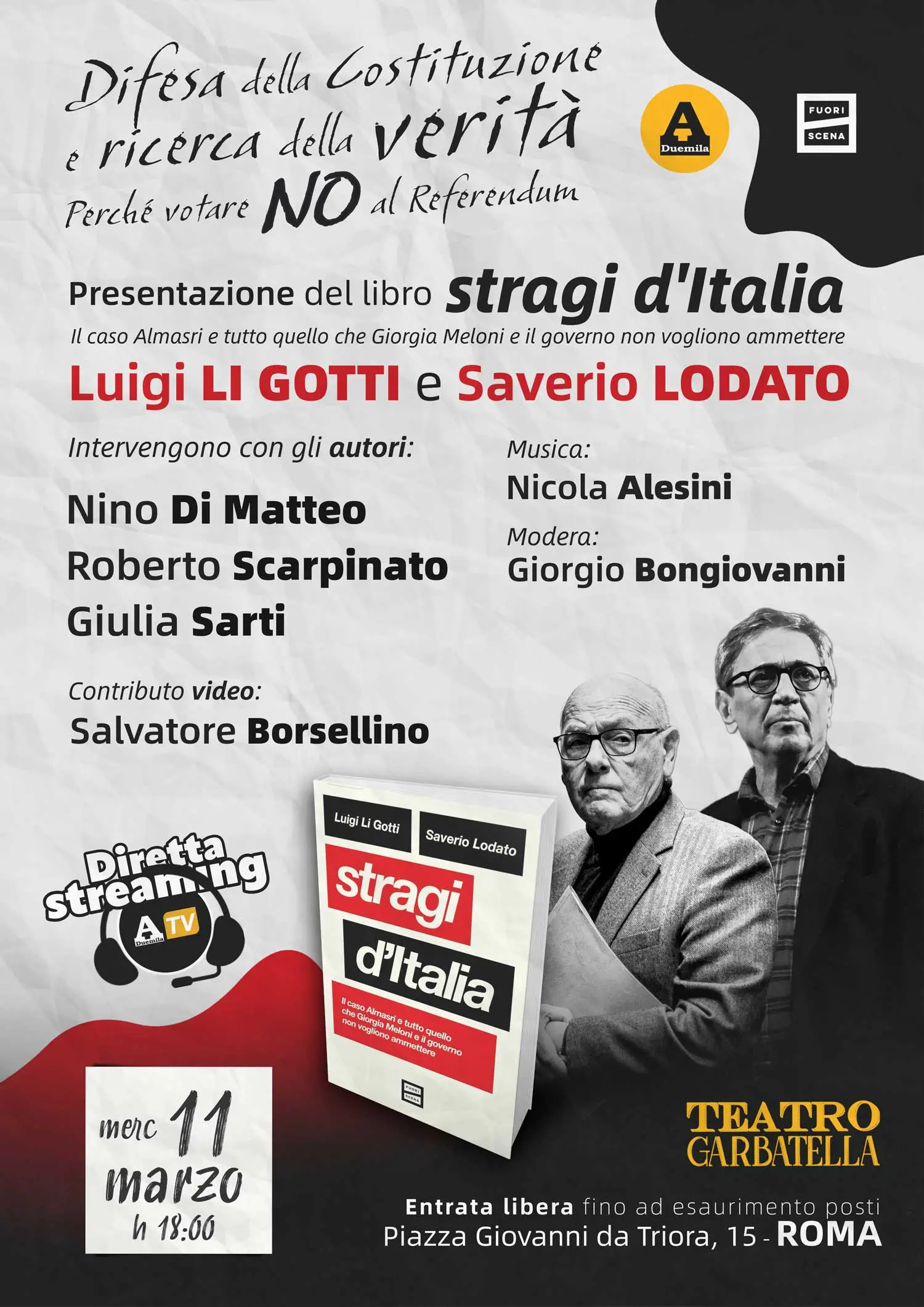 Presso il Teatro Garbatella (Piazza Giovanni da Triora, 15), si tiene la presentazione del libro “Stragi d’Italia”, scritto a quattro mani dall’avvocato Luigi Li Gotti e dal giornalista e scrittore Saverio Lodato. L’evento si intitola “Difesa della Costituzione e ricerca della verità: Perché votare NO al Referendum” e vuole essere un momento di profonda riflessione […] L'articolo Perché votare no al Referendum, il dibattito con Di Matteo e Scarpinato alla presentazione del libro Stragi d’Italia: la diretta proviene da Il Fatto Quotidiano.