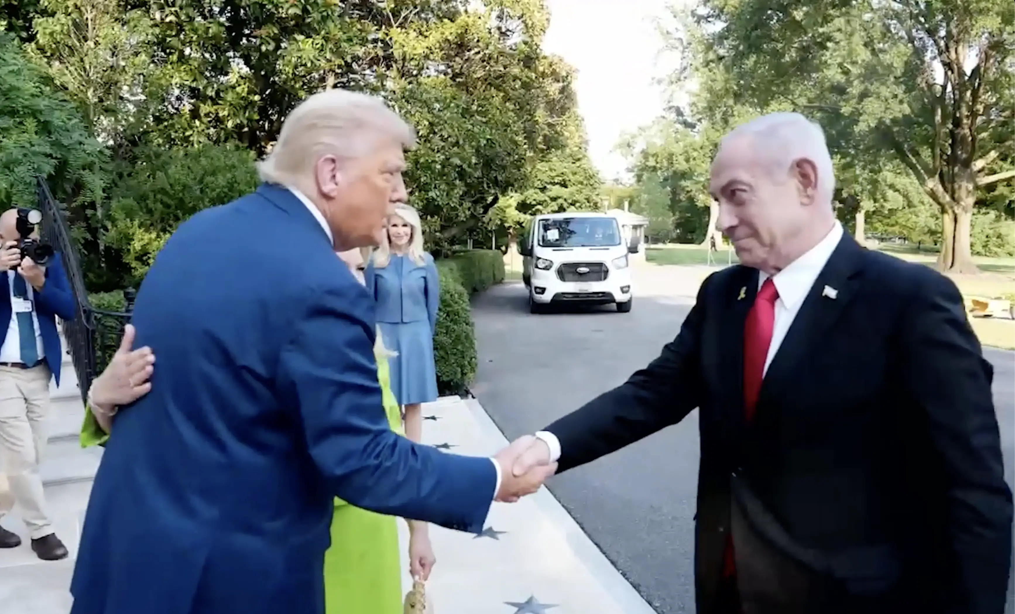 Strette di mano e abbracci: l’arrivo di Netanyahu e la moglie alla Casa Bianca. L’incontro con Trump