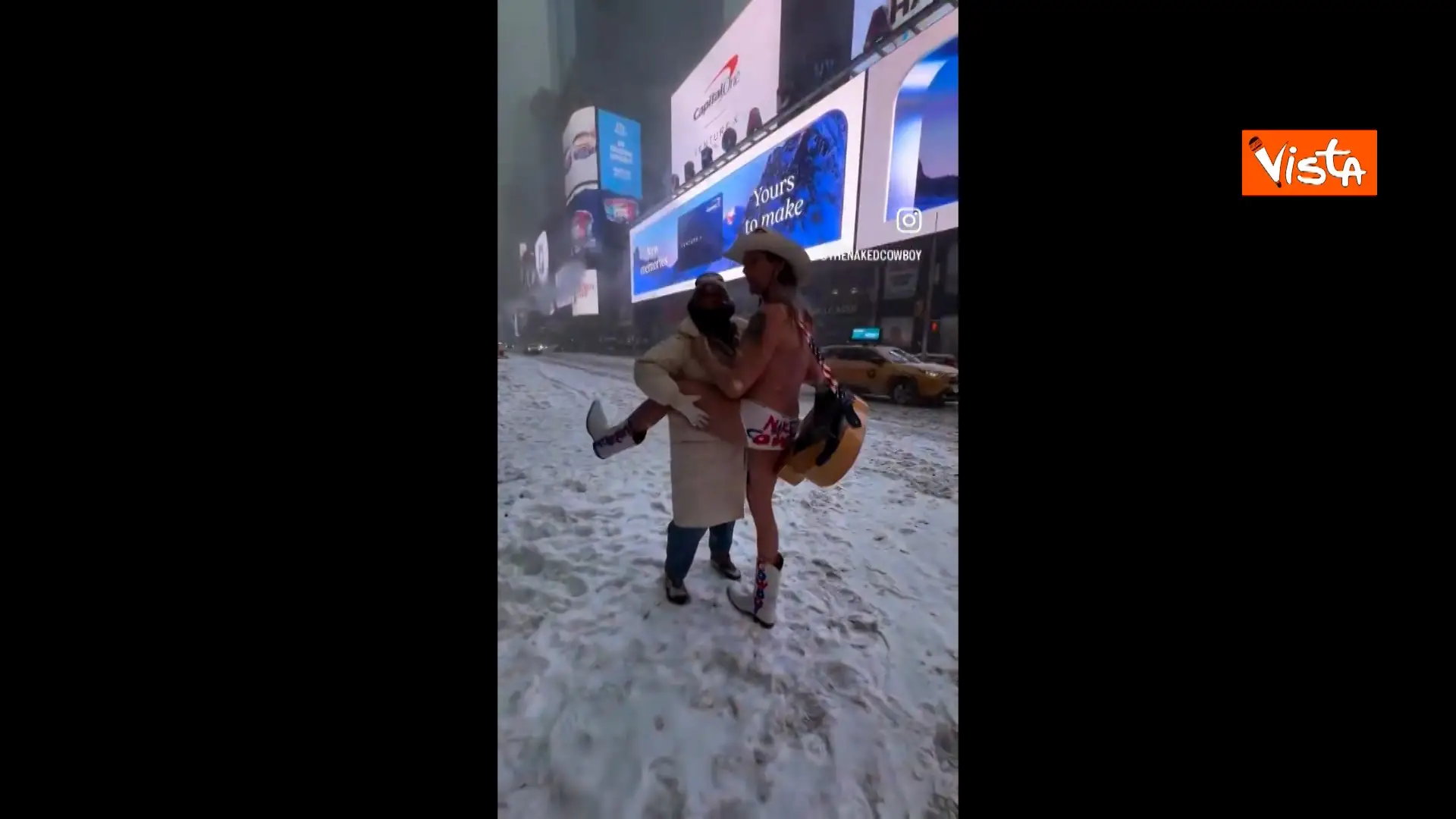 Suona la chitarra in mutande durante la tempesta di neve a New York: il gelo non ferma il “cowboy” – Video