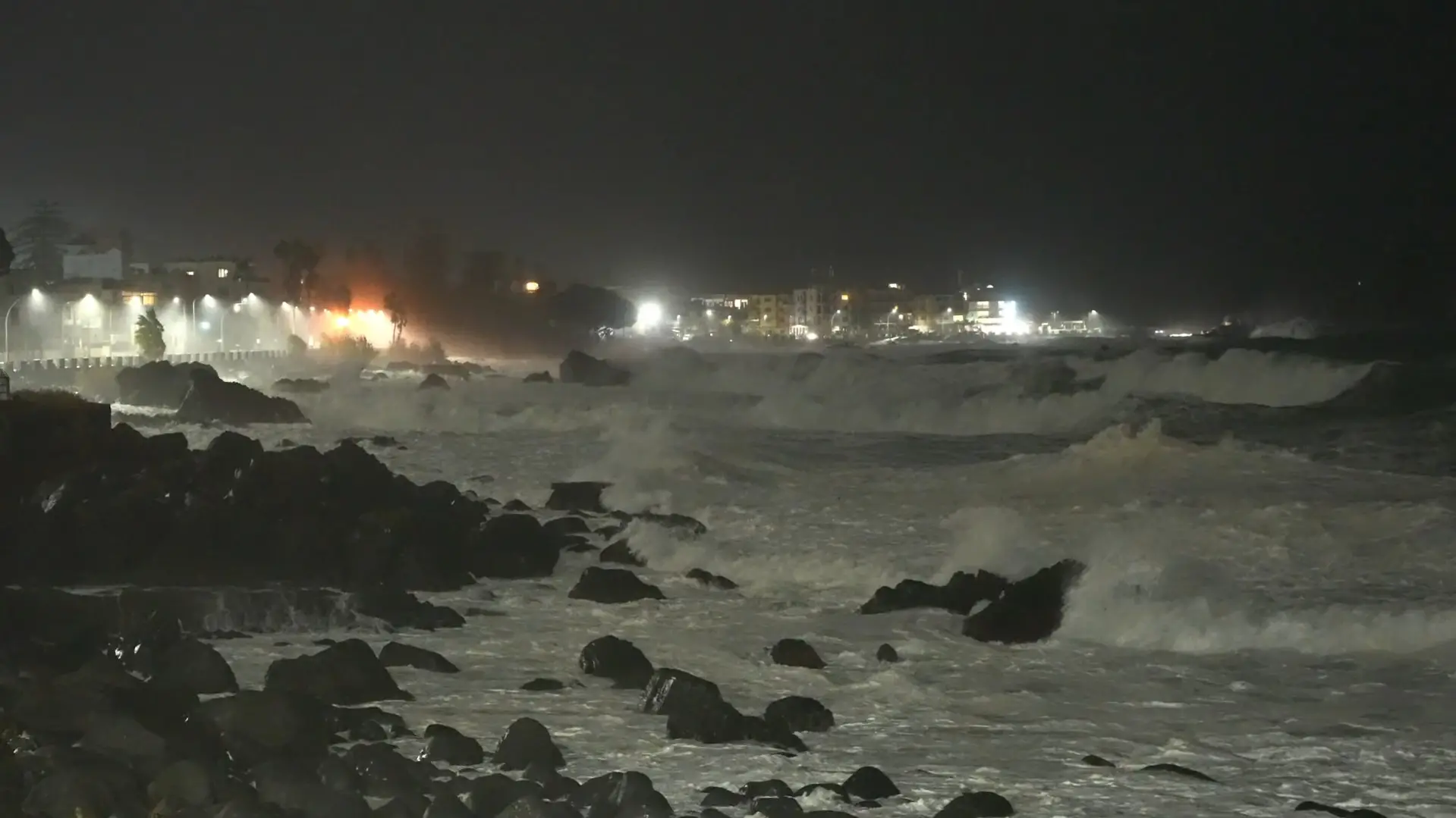 Super mareggiata ad Aci Castello, le onde alte 8 metri fanno paura: il video nella notte
