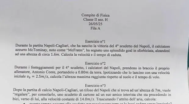 Un compito di fisica con esercizi a tema Napoli. È l’idea del professor Mario Rainone del Liceo scientifico Elio Vittorini che nei giorni successivi alla vittoria del quarto scudetto...