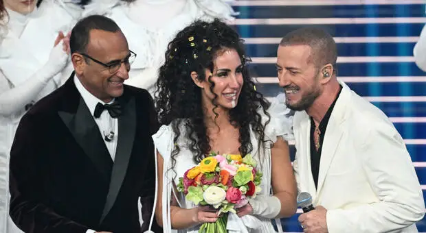 Bianca Riefoli sul palco durante l'esibizione di suo padre Raf: Conti le consegna i fiori di Sanremo