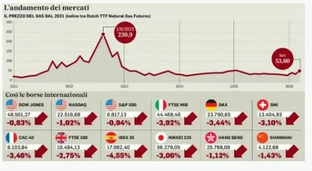 Borse giù, spaventa l?escalation. Balzo dei prezzi di gas e petrolio, tornano i timori per l?inflazione