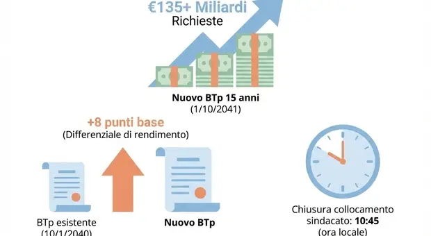Btp, domanda record per nuovo benchmark 15 anni: oltre 135 miliardi per prima tranche in scadenza ottobre 2041