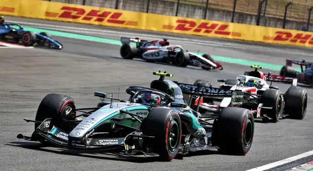 28° giro - Testacoda di Lindblad, che riparte 27° giro - Hamilton si riprende il secondo posto su Leclerc che poi lo ripassa alla prima curva. Ma Hamilton non ci sta, le due Ferrari si...