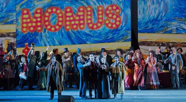 Mimì che fa i fiori di carta si presenta a Rodolfo con un mazzo di girasoli, mentre quelli del quadro di Van Gogh fioriscono su schermi digitali. Davanti al Café Momus prendono vita...