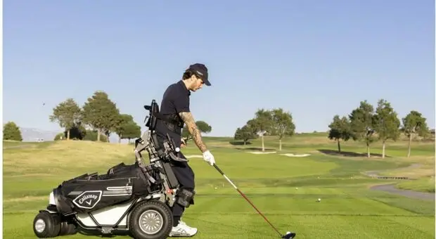 Manuel Bortuzzo si allena a golf al Marco Simone grazie a una macchina speciale. «Che emozione stare in piedi»