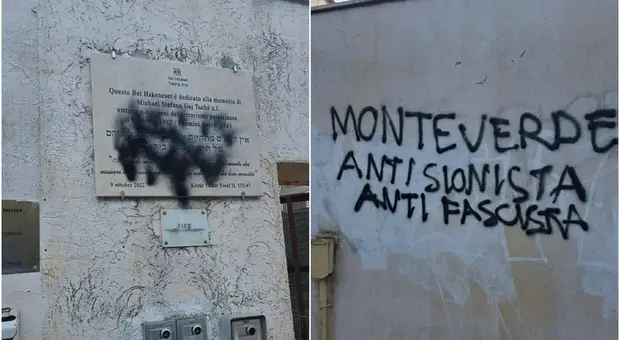 Le scritte ?Monteverde antisionista e antifasicista? e ?Palestina Libera? sono apparse alla sinagoga in via Giuseppe Pianese a Roma e imbrattata con vernice nera la targa...