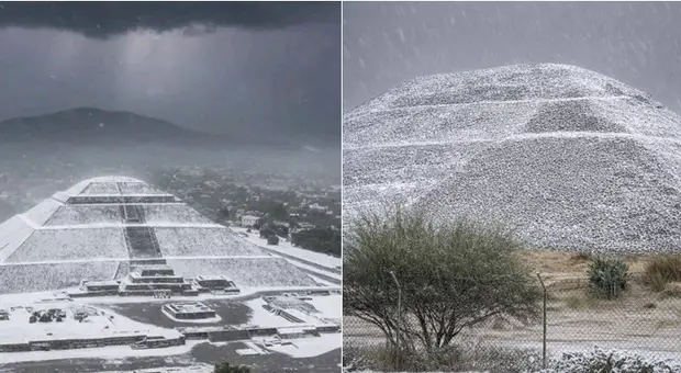 Teotihuacán imbiancata dalla grandine: templi e piramidi sotto la prima tempesta dell?anno nel Valle del Messico