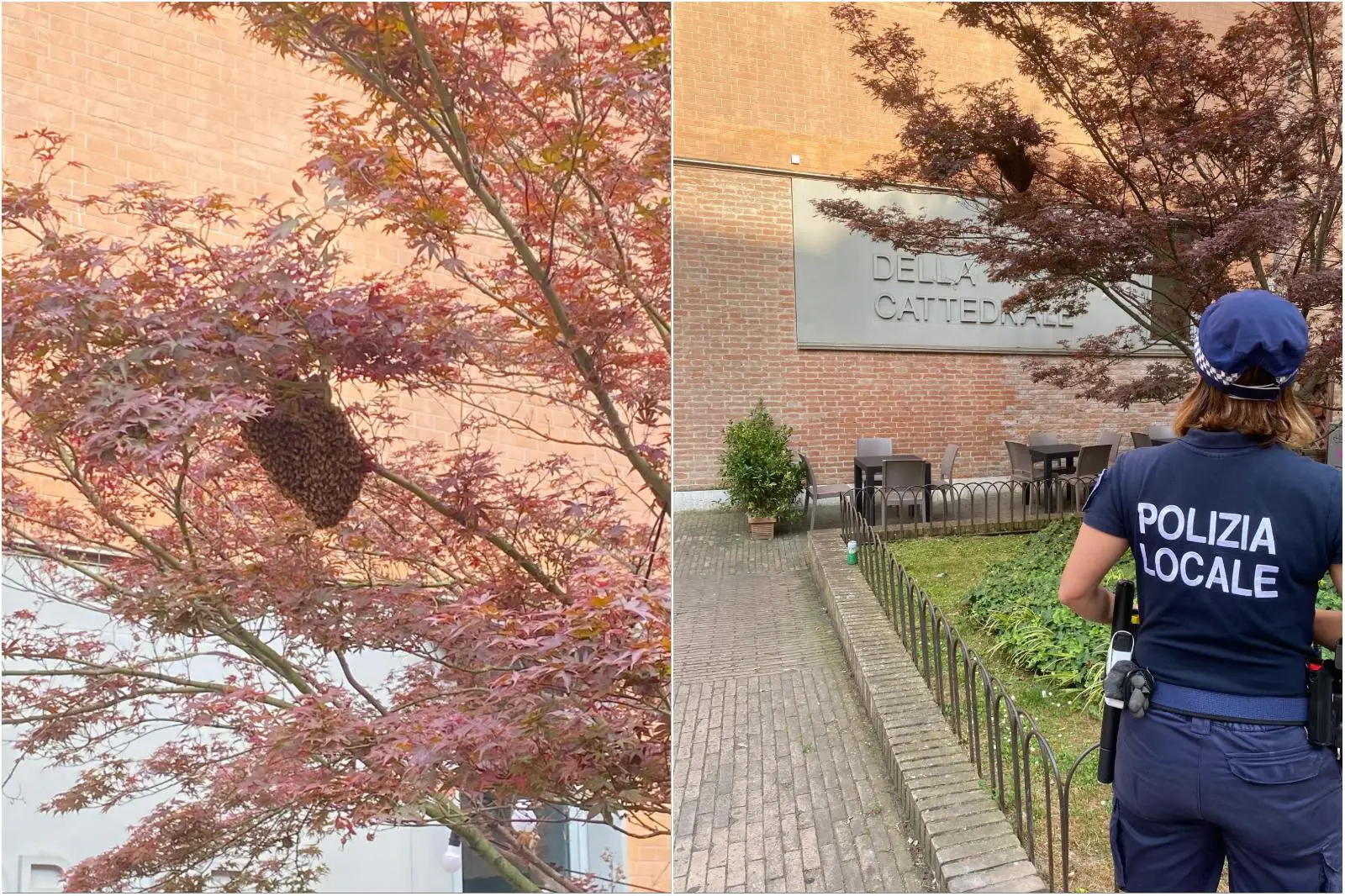 L'intervento è stato eseguito con un apicoltore e la Polizia Locale che ha transennato la zona urante la delicata operazione