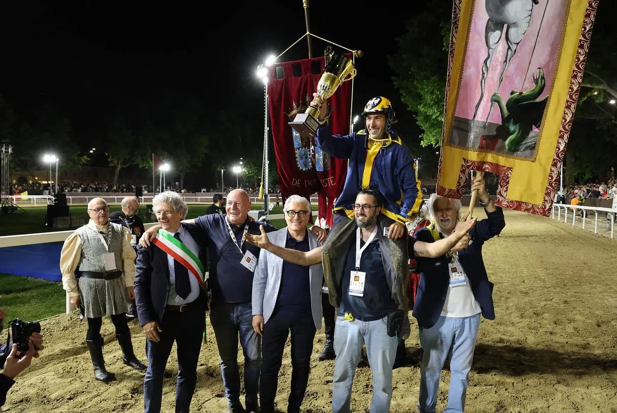 Per il fantino sardo, detto Tremendo, si tratta del sesto drappo di San Giorgio (e il quarto consecutivo). Per la contrada gialloblu è il 16esimo successo. La gara è iniziata dopo mezzanotte e dopo tre false partenze .