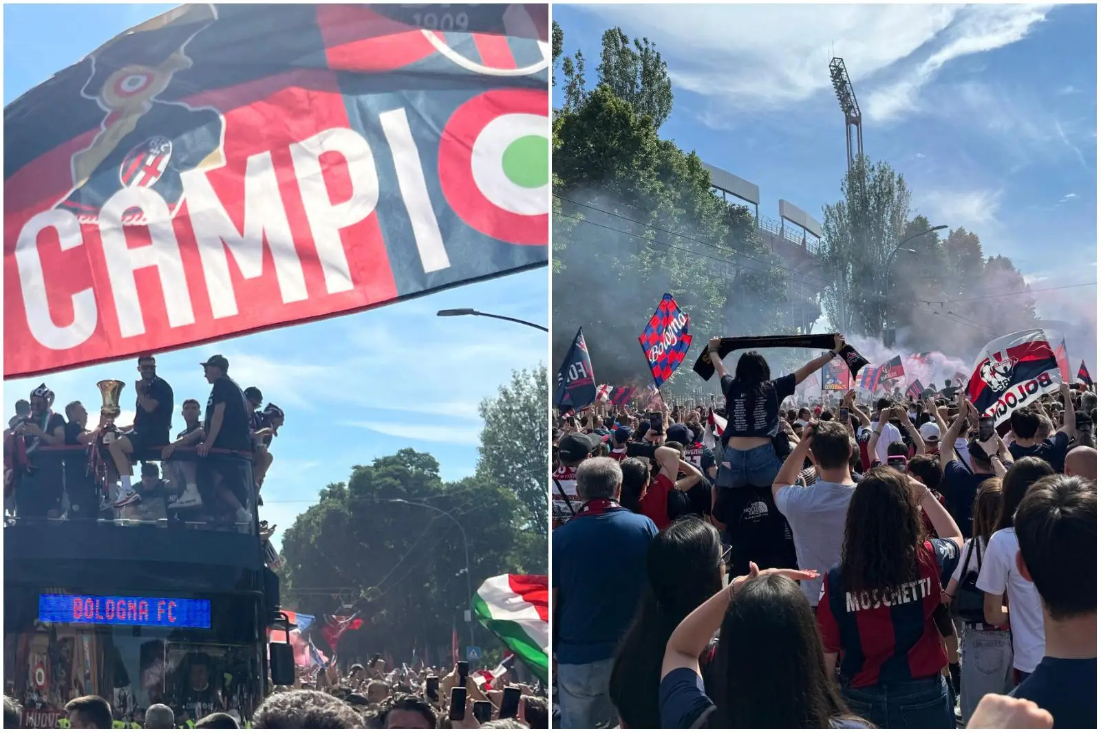 Emozioni senza fine, la città è tutta rossoblù per celebrare il traguardo raggiunto dalla squadra di Vincenzo Italiano. Bandiere, sciarpe, cori per una domenica di festa