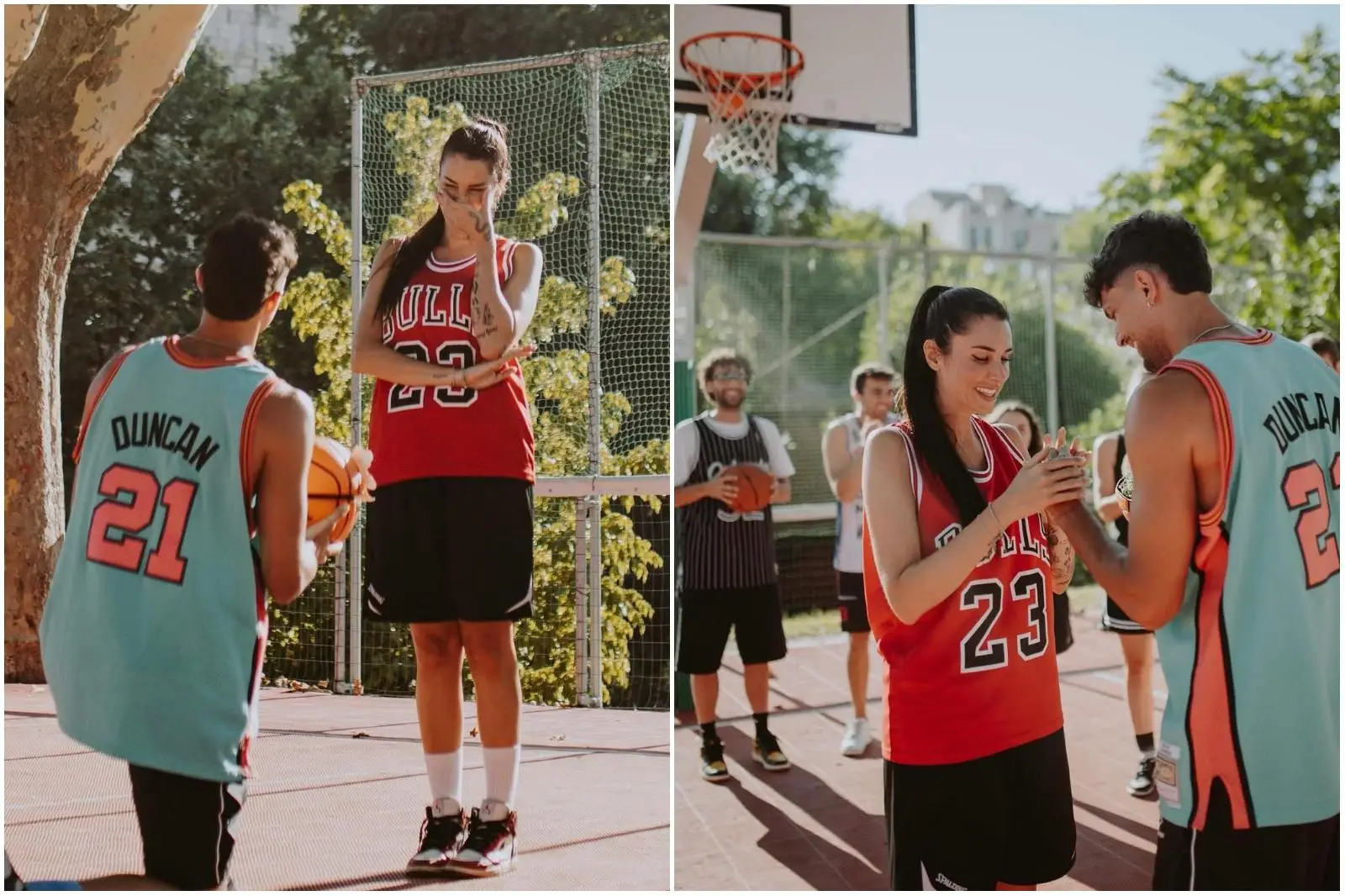 Il giocatore di basket ha chiesto all’influencer, ex cestita poi showgirl tra Uomini e Donne e Grande Fratello di sposarlo durante una partita con gli amici. L’anello custodito in un pallone