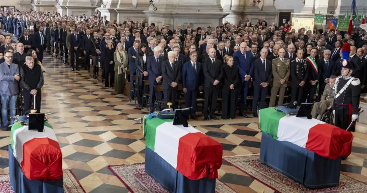 ROMA (ITALPRESS) – Tutte le più alte cariche dello Stato hanno partecipato nel pomeriggio alle esequie dei tre carabinieri mortinell'esplosione del casolare a Castel D'Azzano nel veronese, il sottotenente Marco Piffari, del maresciallo Valerio Daprà edell'appuntato Davide Bernardello. Nella basilica di Santa Giustina a Padova erano infatti presenti, tra gli altri, il presidente della Repubblica, Sergio Mattarella; il presidente del Senato, Ignazio La Russa; il presidente della Camera, Lorenzo Fontana; la premier, Giorgia Meloni, e i due vicepremier Antonio Tajani e Matteo Salvini. Nel suo intrervento, il ministro della Difesa Guido Crosetto ha sottolineato come “l'Italia intera si raccoglie nel dolore, rendendo omaggio a tre uomini dell'Arma. So che non ci sono parole per consolare, nulla che possa colmare il vuoto che lasciano Marco, Valerio e Davide. Ma una promessa posso farla: i nostri nomi sono scritti sulla sabbia della memoria di chi ci vuole bene, e con il tempo svaniranno. Il nome dei giusti, invece, di chi ha dato la vita per la Patria, è scritto nella roccia della memoria della Repubblica. Le forze armate sono custodi di quella memoria. E tra molti anni, quando nessuno di noi sarà presente, ci sarà lo Stato a rendere onore”. Monsignor Gian Franco Saba, ordinario militare per l'Italia, nel corso dei funerali ha detto: “E' una grande famiglia che si ritrova qui per salutare Marco, Valerio e Davide. Ci stringiamo alla grande famiglia dell'Arma, ci stringiamo a voi cari familiari perchè possiate sentire l'abbraccio di tutti e la preghiera unanime. Ci stringiamo a tutti coloro che sono stati feriti nel tragico evento. E' dolorosamente e umanamente incompressibile il drammatico evento. Questi nostri cari fratelli, proprio mentre celebravano il loro servizio per il bene comune, hanno sperimentato la convivialità del male”. Il padre di Davide Bernardello ha ricordato il figlio diventato un carabiniere “per realizzare uno dei più grandi sogni della tua vita. Eri limpido, sincero, generoso e sempre pronto ad aiutare”. Il figlio di Valerio Daprà, visibilmente commosso e con voce rotta, ha detto. “Mio padre ha scelto una strada fatta di coraggio sacrificio e responsabilità, per lui era importante quel senso di responsabilità che era costantemente presente in lui, insieme alla pacatezza. Anche se questa insensata tragedia lo ha strappato a me e all'affetto di tutti coloro che lo hanno amato, voglio credere che la sua eredità morale continui a parlarmi anche nel silenzio”. Il fratello di marco Piffari ha infine voluto fare un appello: “Il loro sacrificio non sia vano. Chiedo a tutti di stringersi ai nostri militari che operano in Italia e all'estero, ai carabinieri dico grazie per ciò che fate tutti i giorni, avete dato dimostrazioni importanti anche a noi familiari”. Al termine della funzione i feretri sono stati salutati con un lunghissimo applauso dalle tante persone che hanno gremito la piazza antistante la basilica. Avvolti nelTricolore e portati a spalla dai loro colleghi in divisa, sono stati accompagnati dagli onori militari. (ITALPRESS).-Foto: Quirinale-