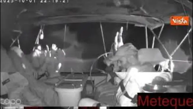 (Agenzia Vista) Israele, 01 ottobre 2025 Ecco le immagini della videosorveglianza delle navi della missione Flotilla, che in contemporanea trasmettono la diretta della navigazione. Sono iniziate le prime manovre di abbordaggio dei soldati israeliani. Ecco gli attivisti con le mani in alto. Flotilla Fonte: Agenzia Vista / Alexander Jakhnagiev