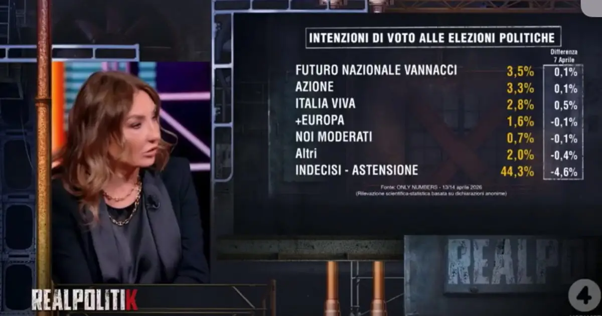 Un nuovo sondaggio sulle intenzioni di voto degli italiani è stato presentato nel corso del programma Realpolitik in onda su Rete 4 mercoledì 15 aprile, a cura della sondaggista Alessandra Ghisleri. Cosa dicono i dati elaborati da Only Numbers per il programma di Tommaso Labate? La rilevazione fotografa gli orientamenti di voto in caso di elezioni, confermando la leadership di Fratelli d'Italia. Il partito guidato da Giorgia Meloni si attesta al 28,5%, in crescita di mezzo punto rispetto alla precedente rilevazione. Segue il Partito Democratico di Elly Schlein, al 22,3%, con una flessione dello 0,2%. Insomma, nei giorni dello scontro tra la premier e Donald Trump un risultato che la sinistra probabilmente non si aspettava... Il Movimento 5 Stelle di Giuseppe Conte si colloca al 12,0%, in aumento dello 0,4%, mentre Forza Italia raggiunge l'8,7% (+0,2%). La Lega si posiziona all'8,1%, con un incremento dello 0,3%, e l'Alleanza Verdi e Sinistra al 6,5% (+0,3%). Tra le forze minori, Futuro Nazionale guidato da Roberto Vannacci è rilevato al 3,5% (+0,1%), Azione al 3,3% (+0,1%) e Italia Viva al 2,8% (+0,5%). +Europa si attesta all'1,6% (-0,1%), mentre Noi Moderati è allo 0,7% (-0,1%). La voce “Altri” raccoglie il 2,0% (-0,4%). Insomma, i tre partiti principali della maggioranza di centrodestra crescono, mentre nell'opposizione è già iniziato lo scontro per la guida a guidare la coalizione nel 2027.