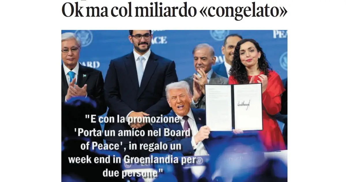 La vignetta di Osho sulla prima pagina de Il Tempo di venerdì 23 gennaio. Vladimir Putin ha accettato l'invito a entrare nel Board per la pace per Gaza. L'annuncio è stato dato da Donald Trump da Davos, proprio mentre il presidente russo ringraziava il presidente americano per l'invito e annunciava di aver dato istruzioni al ministero degli Esteri perché valutasse l'ingresso di Mosca nell'organismo creato dal presidente americano per la ricostruzione della Striscia di Gaza. L'ingresso nel board costa un miliardo di dollari. La Russia intende pagare? Sì, con una soluzione ad hoc prospettata da Putin. "Considerando il rapporto speciale della Russia con il popolo palestinese, credo che potremmo destinare un miliardo di dollari di beni russi congelati sotto la precedente amministrazione statunitense al Board per la pace", ha detto il presidente russo.