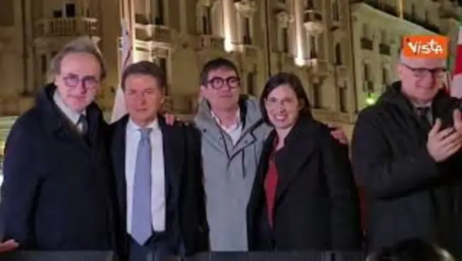 L'abbraccio sul palco tra Schlein, Conte, Fratoianni e Bonelli durante festa vittoria No