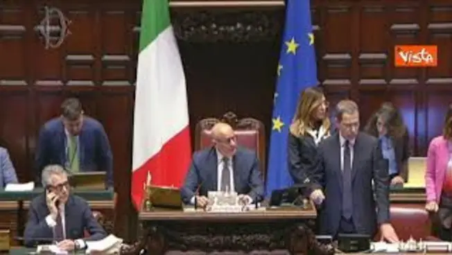 (Agenzia Vista) Roma, 24 aprile 2026 In apertura della seduta per la votazione finale sul Dl Sicurezza, le opposizioni hanno cantato 'Bella Ciao' in Aula alla Camera, in occasione della festa del 25 aprile. Fonte: Agenzia Vista / Alexander Jakhnagiev