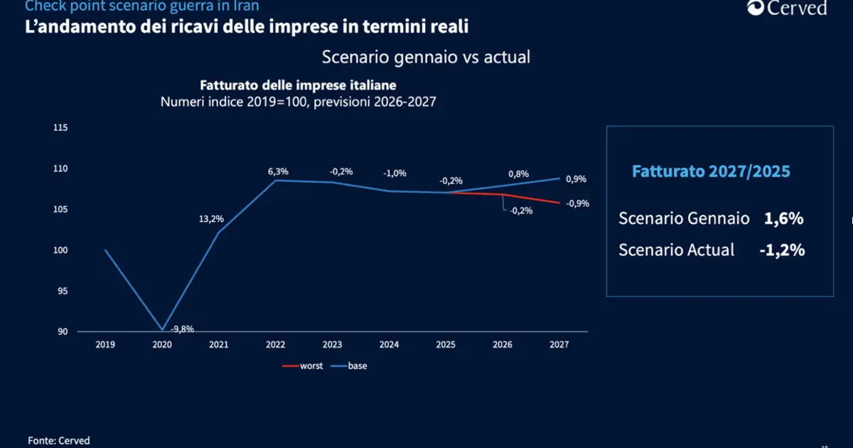 Una crisi prolungata e un nuovo shock energetico potrebbero portare la congiuntura economica italiana alla stagnazione nel triennio 2026-28. Il Termometro Italia di MBS Consulting rileva un'impennata delle preoccupazioni delle famiglie mentre Cerved Rating Agency stima un aumento della probabilità di default delle imprese del 22% in caso di shock energetico simile al 2022 L'attacco di Stati Uniti e Israele all'Iran genera gravi tensioni nell'area mediorientale e delinea un nuovo scenario macroeconomico internazionale, con immediati riflessi sull'economia italiana. Cerved, attraverso l'analisi dei dati e utilizzando i suoi modelli econometrici, ha rilevato che la stagnazione dell'economia e la contrazione dei ricavi delle imprese potrebbero concretizzarsi già nell'anno in corso. Cerved Rating Agency ha stimato un aumento della probabilità di default delle imprese del 22% nel caso in cui lo shock energetico fosse simile a quello verificatosi nel 2022. MBS consulting ha effettuato una rilevazione straordinaria del Termometro Famiglie mostrando un'impennata della preoccupazione delle famiglie in merito al contesto socioeconomico. Lo scenario macroeconomico di Cerved La nuova analisi Cerved incorpora gli effetti del recente attacco di Stati Uniti e Israele all'Iran e dell'estensione del conflitto mediorientale su scala regionale: aumento del prezzo di petrolio e gas naturale: con conseguente incremento delle tensioni inflazionistiche sia nell'area euro che in Italia, entrambe fortemente dipendenti dalle forniture estere di gas e oil. potenziale disruption della supply chain: alcune filiere potrebbero subire rallentamenti o fermarsi del tutto a causa del mancato transito delle forniture nello stretto di Hormuz. chiusura del ciclo espansivo della Banca Centrale Europea: a fronte del rischio di un aumento dei prezzi la BCE potrebbe aumentare i tassi già nel corso del 2026. Tutte queste dinamiche renderebbero più fragile la congiuntura economica italiana rendendola di fatto ferma nel triennio previsivo 2026-2028. Le cause sono da ricercare da un lato nell'indebolimento dei consumi privati, penalizzati dai nuovi rincari delle bollette energetiche e dei carburanti, dall'altro dalla stabilizzazione degli investimenti pubblici, che negli ultimi anni avevano contribuito in maniera significativa alla crescita grazie ai bonus edilizi e al PNRR. Le tensioni internazionali e la chiusura delle rotte mediorientali avrebbero un impatto anche sul commercio internazionale, già colpito dai dazi statunitensi, e porterebbero al calo sia dell'import che dell'export italiano. Le imprese potrebbero quindi subire una contrazione dei fatturati reali. Nello scenario attuale, i ricavi reali si porterebbero in area negativa, con una flessione del -0,2% nel 2026 e del -0,9% nel 2027. Il risultato complessivo nel biennio 2026-2027 risulterebbe in calo del -1,2% rispetto al 2025. Stretto di Hormuz: gli impatti della crisi sui settori La crisi geopolitica nell'area del Golfo e il blocco dello Stretto di Hormuz stanno generando impatti immediati e trasversali sull'economia italiana, con ripercussioni differenziate tra settori produttivi, filiere industriali e comparti dei servizi. Aumento dei costi degli input energetici: rincari di gas naturale, petrolio, combustibili industriali e energia elettrica stanno colpendo in modo particolarmente severo i settori più esposti dal punto di vista degli input energetici e chimici: settori dipendenti dal gas: ceramica, piastrelle, carta, vetro, cemento e materiali da costruzione, laterizi, fonderie; settori petrolio‑dipendenti: raffinazione, chimica, plastica e gomma; power generation e filiera energetica; trasporti aerei, marittimi, autotrasporto; agricoltura, soprattutto per l'aumento del costo dei fertilizzanti e dei carburanti agricoli. 2. Gravi problemi logistici e interruzioni della supply chain. Il blocco dello Stretto di Hormuz e la deviazione del traffico marittimo internazionale determinano ritardi, costi aggiuntivi e difficoltà di approvvigionamento per filiere critiche: trasporti marittimi e aerei, con ripercussioni sulla logistica nazionale e internazionale; fertilizzanti e mangimi, con effetti sull'agroalimentare; microchip e componentistica elettronica, fondamentali per automotive e meccanica; prodotti del sistema moda (tessuti, filati, accessori, packaging), fortemente dipendenti da catene del valore asiatiche. 3. Impatto immediato sul fatturato dei servizi legati alla mobilità e al turismo. La combinazione tra costi più elevati, instabilità delle rotte e incertezza della domanda globale genera una contrazione significativa dei ricavi nei servizi turistici: trasporti aerei passeggeri, aeroporti, agenzie viaggio e tour operator; alberghi, strutture ricettive, ristorazione, shopping tourism, crociere e viaggi organizzati La crisi nello Stretto di Hormuz si configura come uno shock energetico, logistico e di domanda che interessa simultaneamente industria, servizi e filiere. Le imprese italiane si trovano ad affrontare un quadro caratterizzato da aumento dei costi, interruzioni nelle forniture, pressioni sui ricavi e rallentamento dei consumi. Cerved Rating Agency, approfondimento sul rischio di credito A seguito dello shock energetico derivante dal conflitto ucraino, la probabilità di default (PD) media delle imprese con rating emesso da Cerved Rating Agency aumentò in modo significativo e raggiunse il livello massimo da un decennio. L'aumento dei prezzi dell'energia aggravò, infatti, una situazione già complessa per le imprese, provate dai mesi difficili trascorsi durante la pandemia di Covid (vedasi Grafico 1). Partendo da un livello di probabilità di default medio attuale, uno shock energetico simile a quello del 2022 con conseguente inasprimento della politica monetaria potrebbe tradursi in un aumento della PD di circa il 22%, sfiorando i livelli del 2023, con un impatto significativo soprattutto per i settori energy-intensive. Tuttavia, va puntualizza