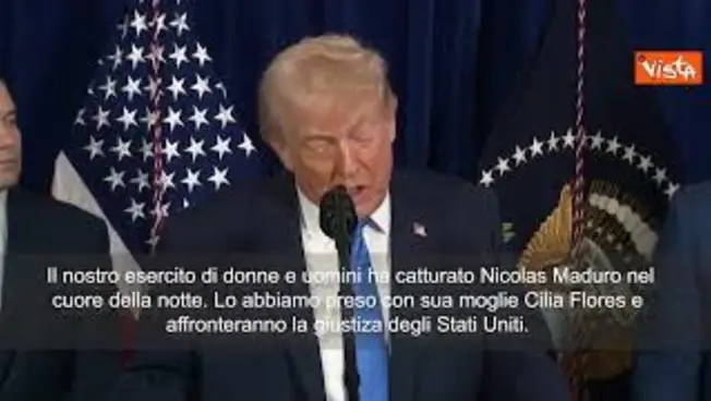(Agenzia Vista) Mar-a-Lago, 03 gennaio 2026 "Nessuna nazione al mondo potrebbe ottenere quello che ha ottenuto l'America ieri in un così breve periodo di tempo. Tutte le capacità militari del Venezuela sono state rese impotenti quando il nostro esercito è riuscito a catturare Maduro nel cuore della notte. Era tutto buio, oscuro. Lo abbiamo catturato con sua moglie Cilia Flores e affronteranno la potenza della giustizia degli Stati Uniti. Saranno a New York e verranno incriminati per narcoterrorismo contro gli Stati Uniti e contro i loro cittadini”. Così il Presidente Donald Trump dalla sua conferenza stampa a Mar-a-Lago. Courtesy: X Rapid Response 47 Fonte: Agenzia Vista / Alexander Jakhnagiev
