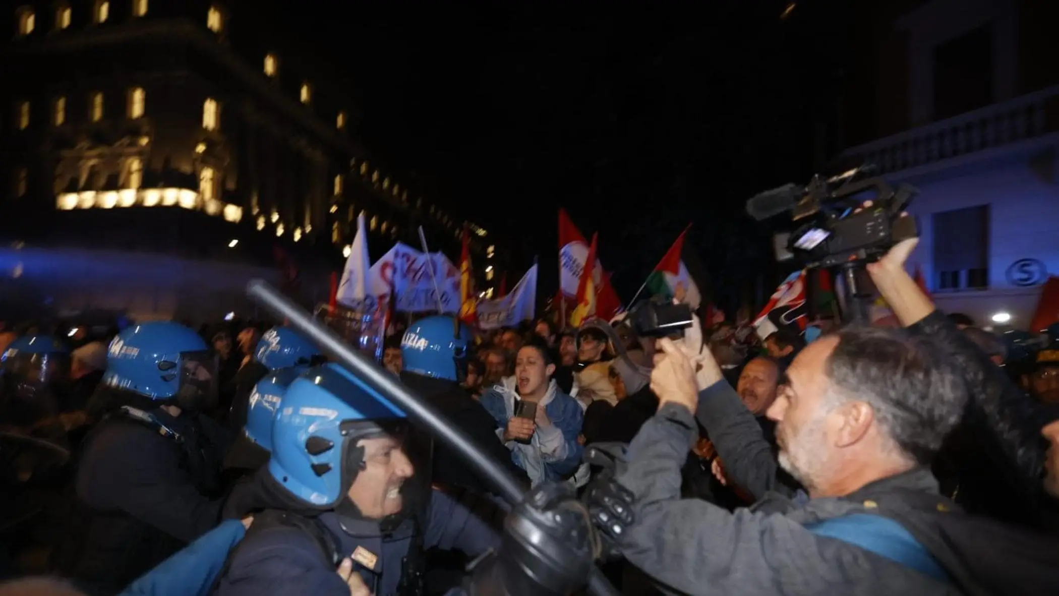 Manifestazione pro Pal: corteo tenta di sfondare lo sbarramento. Idranti della polizia in azione