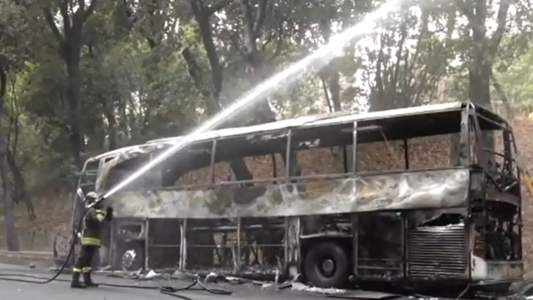 Pullman turistico in fiamme su viale Washington a Villa Borghese, ferito un vigile del fuoco