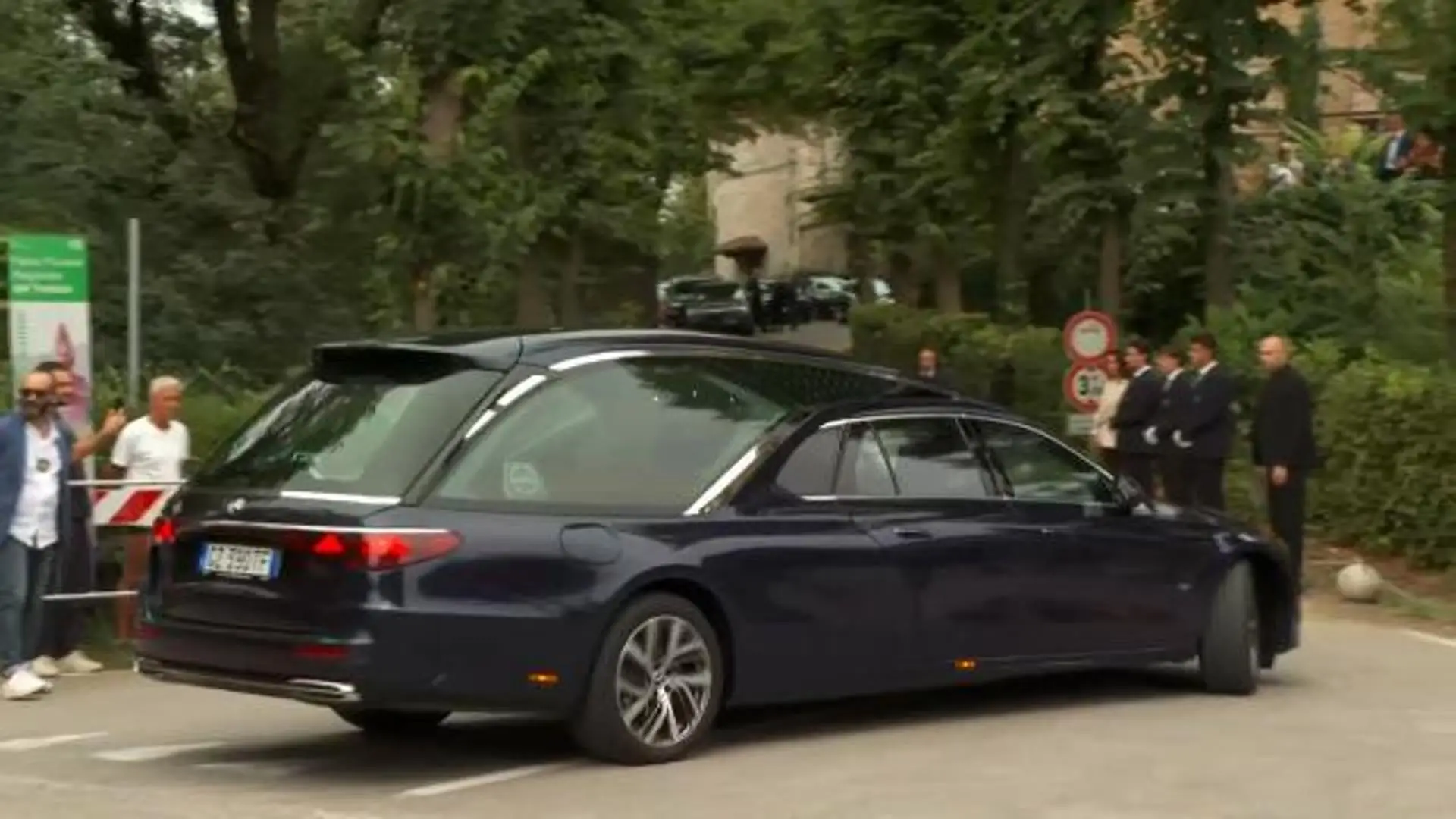 L'arrivo del feretro di Giorgio Armani alla chiesa di San Martino di Rivalta, nel piacentino. I funerali dello stilista scomparso a 91 anni si …