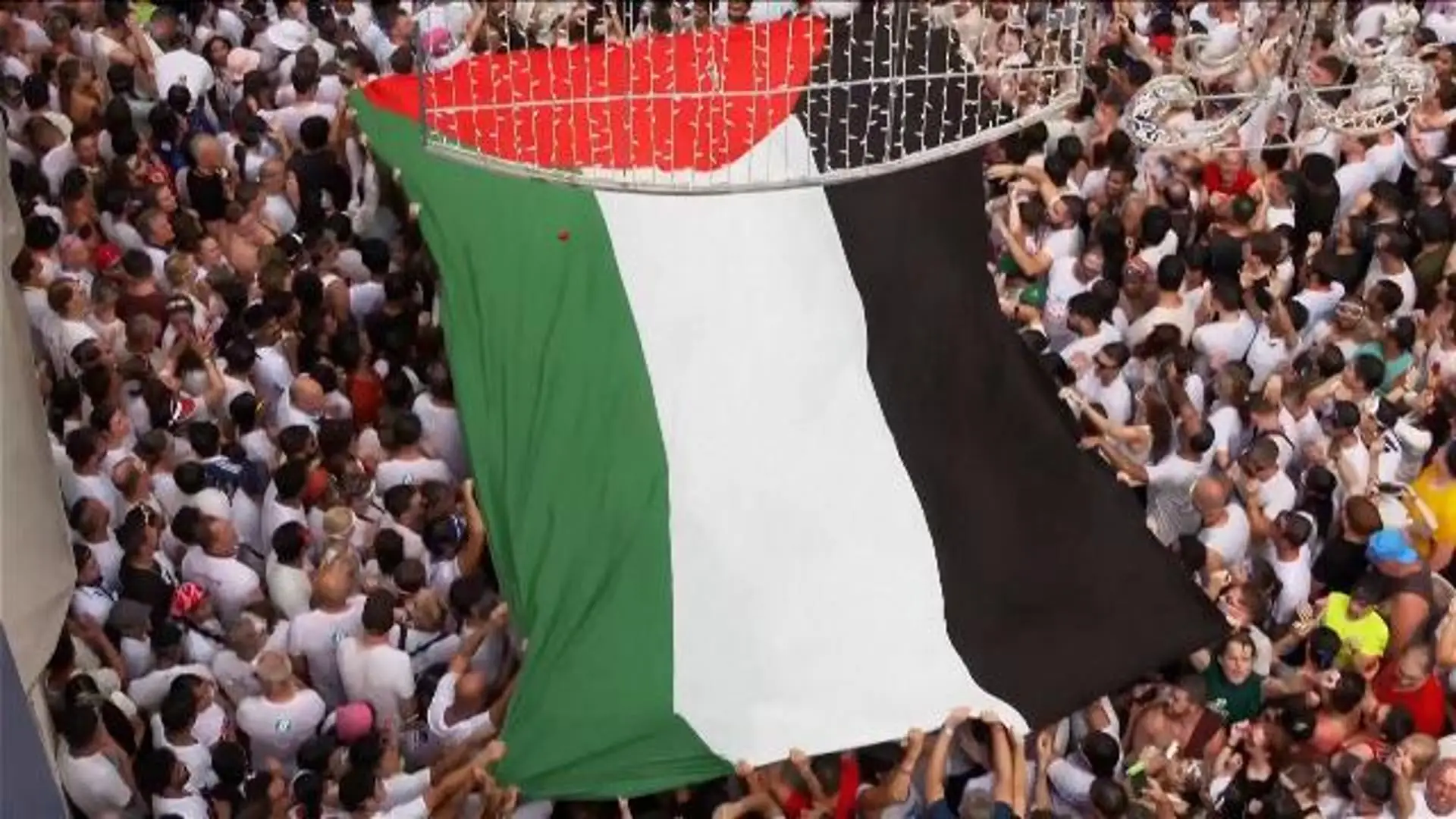 Un’enorme bandiera palestinese è stata srotolata durante la celebre Tomatina di Bunol, il festival spagnolo dove migliaia di persone si lanciano …