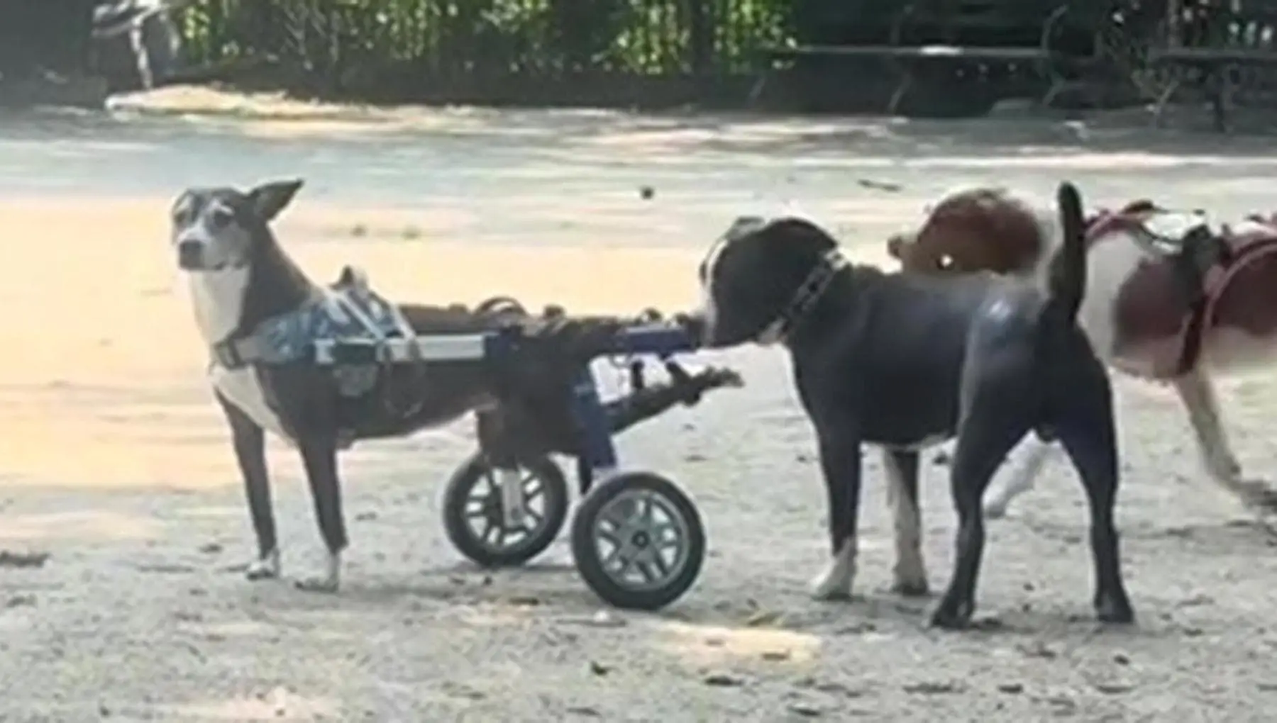 Un cane cerca di giocare con un cucciolo disabile, la scena al parco è una lezione per tutti