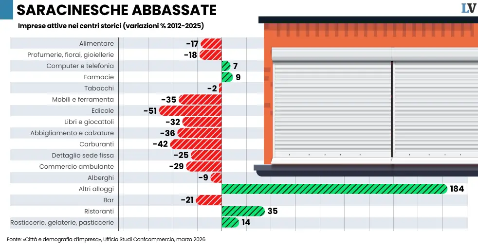Analisi di Confcommercio: tra il 2012 e il 2025 scomparsi 156mila punti vendita, oltre un quarto del totale. Crescono solamente le attività del comparto alloggio e ristorazione (+19mila), sempre più locali sfitti.L’avanzata inarrestabile del commercio online, il cambio di destinazione d’uso di un numero crescente di immobili destinati al turismo mordi e fuggi, con la proliferazione di case vacanza e B&B, ha determinato una progressiva desertificazione commerciale. Botteghe, piccoli punti vendita, negozi di prossimità soprattutto attività artigiane che rappresentavano la caratteristica dei centri urbani italiani, sono diventati sempre più una rarità. È la fotografia impietosa scattata dal report «Città e demografia d’impresa» realizzata dall’Ufficio Studi Confcommercio. Il testo analizza il fenomeno tra il 2012 e il 2025, un arco di tempo che ha visto la scomparsa di circa 156.000 punti vendita del commercio al dettaglio e ambulante, oltre un quarto del totale delle imprese attive all’inizio del periodo. Questa «desertificazione commerciale», non accenna a fermarsi; al contrario, i dati più recenti mostrano un’accelerazione preoccupante, con un tasso di chiusura annuo salito al 3,1% nel 2025, rispetto al 2,2% delle rilevazioni precedenti. Continua a leggere